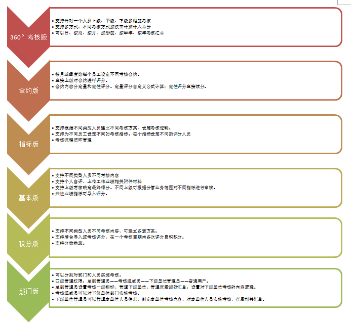 1、系統(tǒng)同時支持KPI關鍵指標和360°考核的需求;